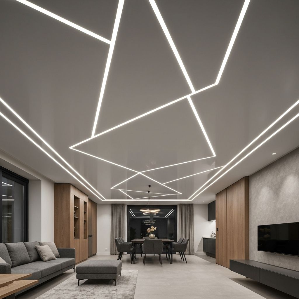 Встроенные LED-профили создают эффектные световые линии на потолке любой конфигурации.